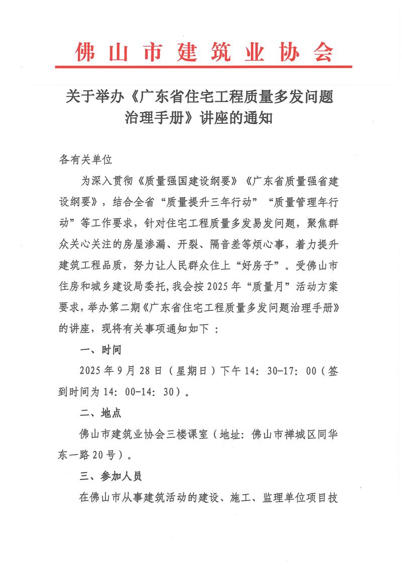 关于举办《广东省住宅工程质量多发问题治理手册》讲座的通知(2025/09/23)