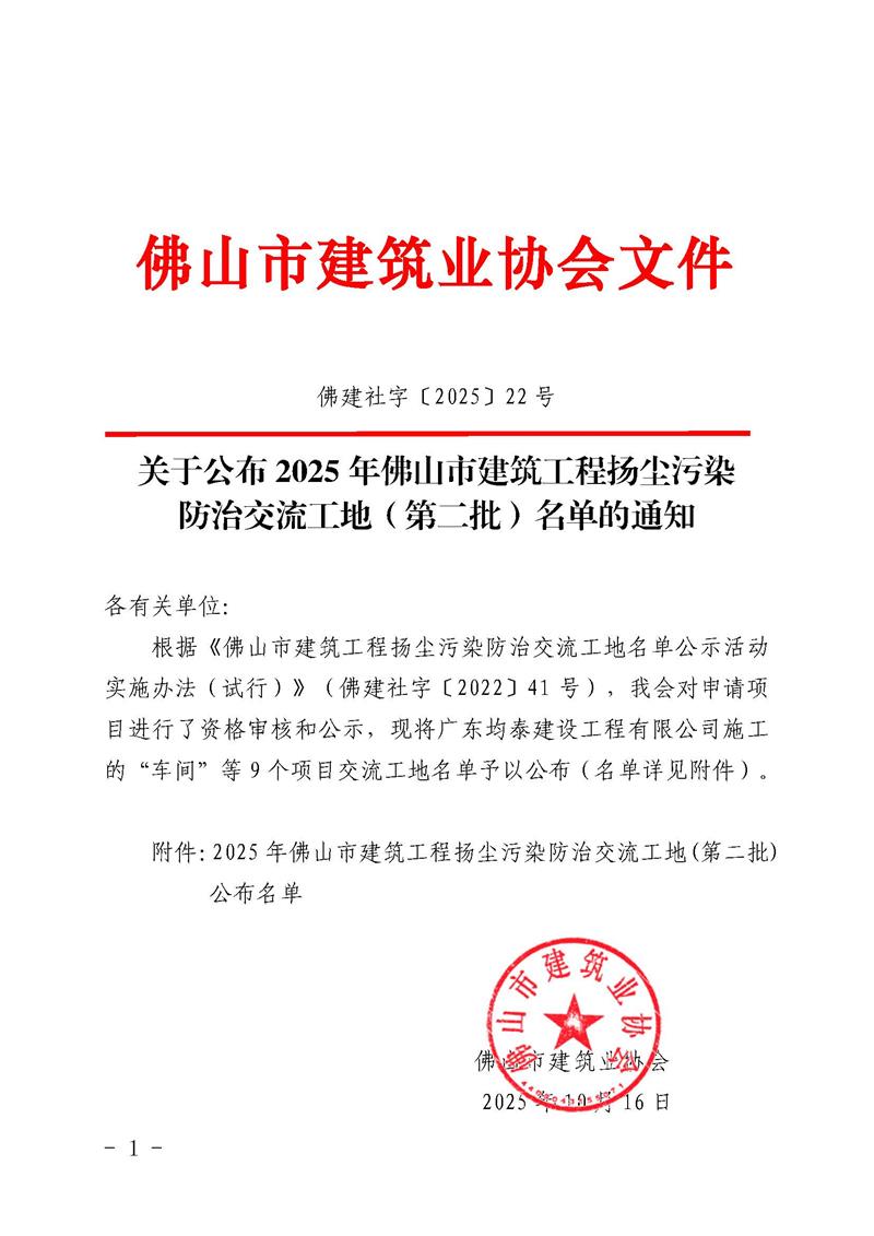 关于公布2025年佛山市建筑工程扬尘污染防治交流工地(第二批)名单的通知(佛建社字〔2025〕22号)