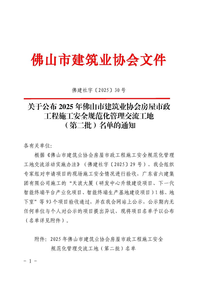 关于公布2025年佛山市建筑业协会房屋市政工程施工安全规范化管理交流工地(第二批)名单的通知(佛建社字〔2025〕30号)