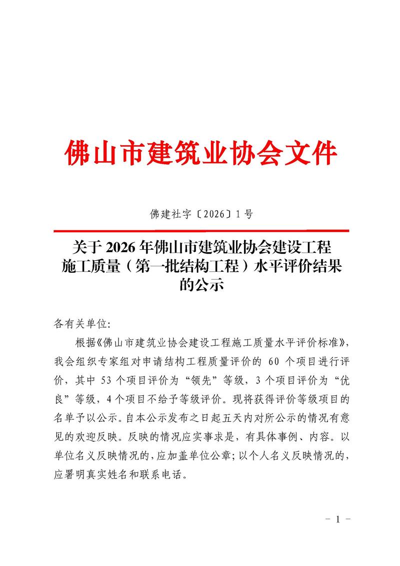 关于2026年佛山市建筑业协会建设工程施工质量(第一批结构工程)水平评价结果的公示(佛建社字〔2026〕1号)