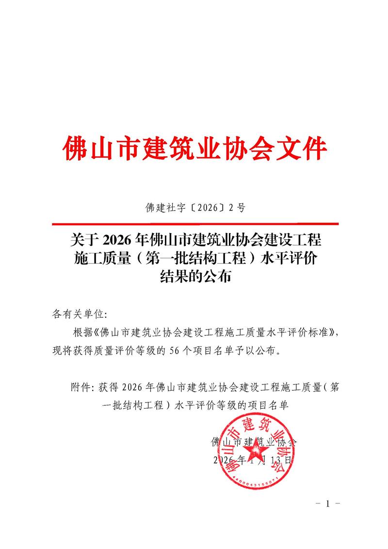 关于2026年佛山市建筑业协会建设工程施工质量(第一批结构工程)水平评价结果的公布(佛建社字〔2026〕2号)