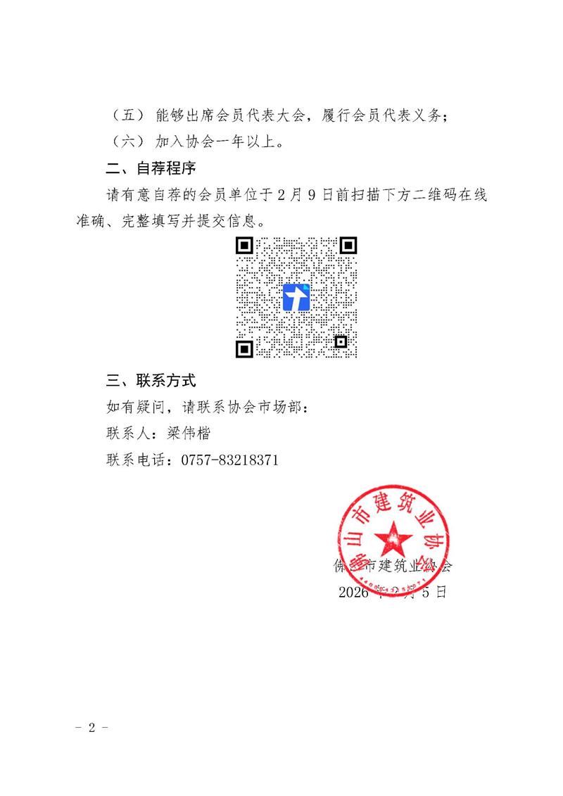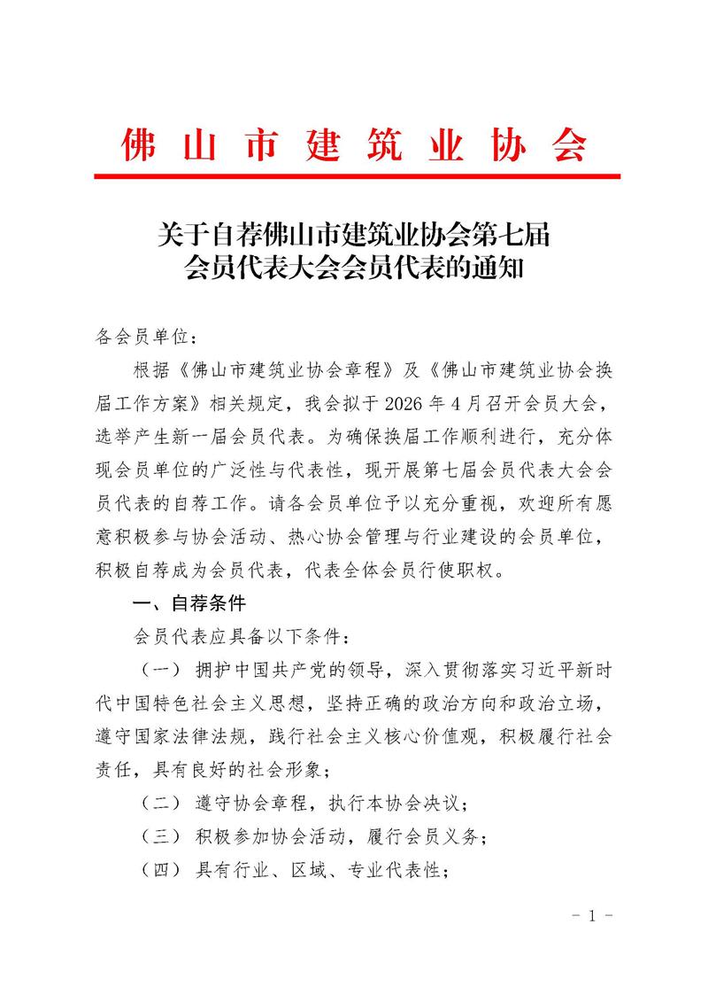 关于自荐佛山市建筑业协会第七届会员代表大会会员代表的通知(2026/02/05)