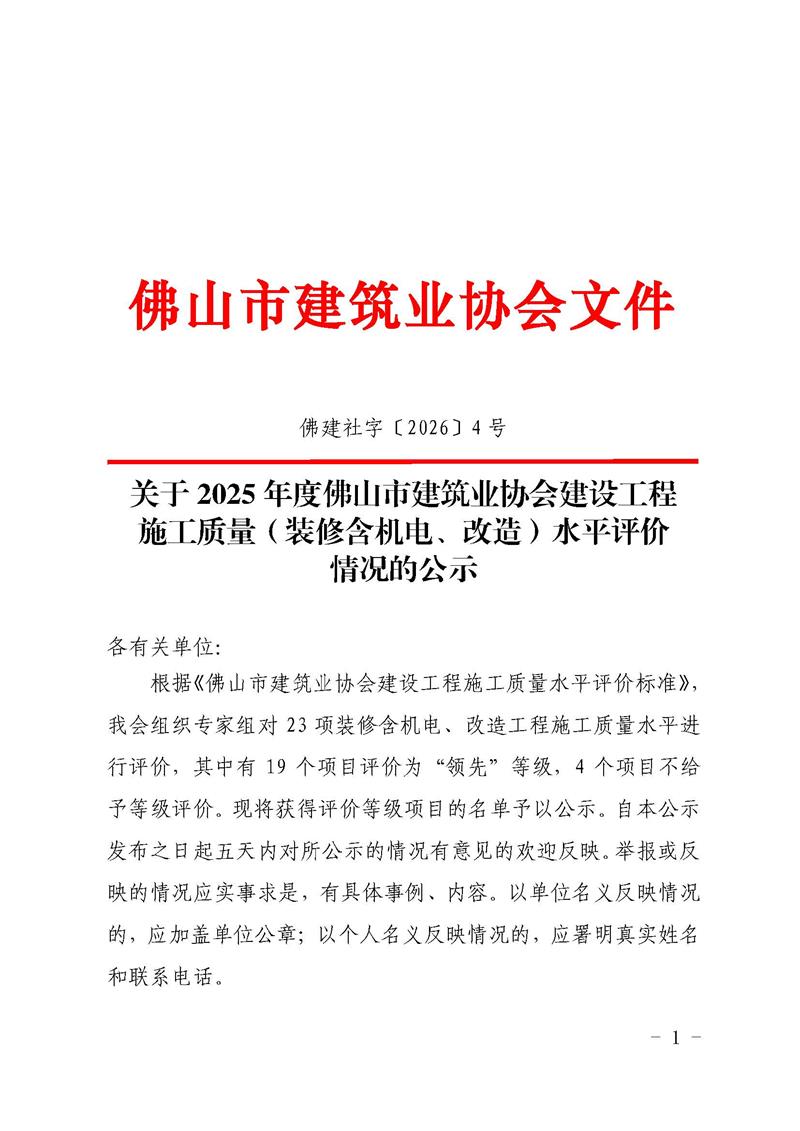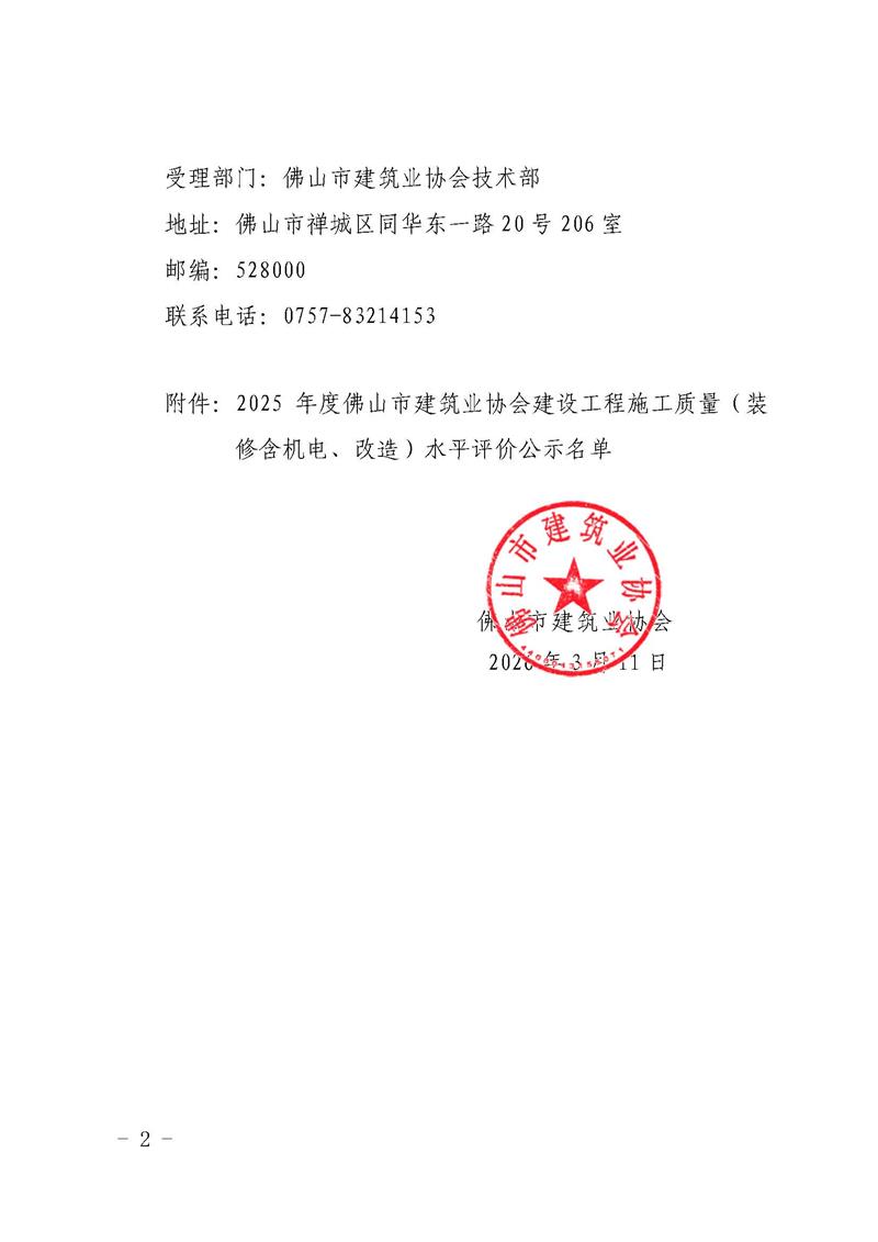 关于2025年度佛山市建筑业协会建设工程施工质量(装修含机电、改造)水平评价情况的公示(佛建社字〔2026〕4号)