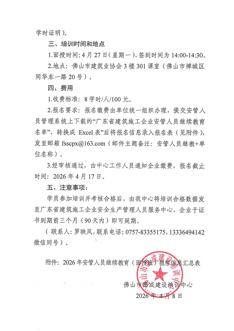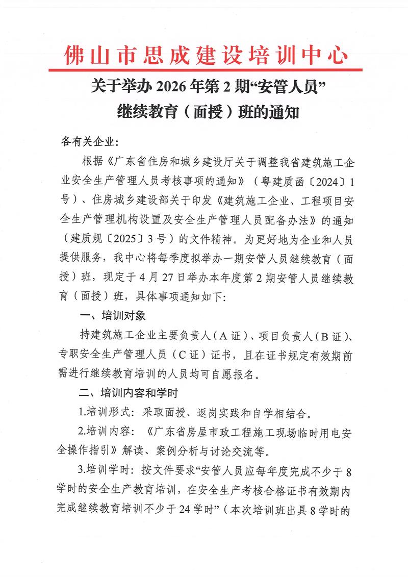 关于举办2026年第2期“安管人员”继续教育(面授)班的通知(2026/04/08)