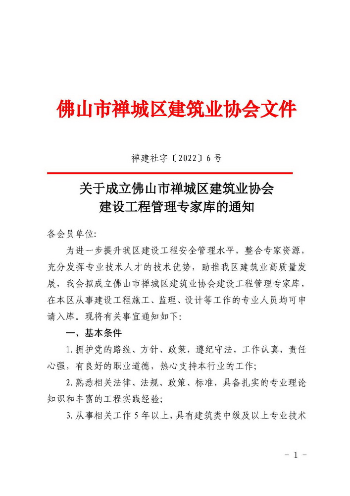 关于成立佛山市禅城区建筑业协会建设工程管理专家库的通知(禅建社字〔2022〕6号)