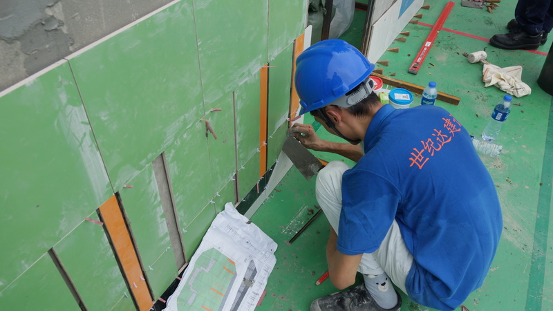 广东世纪达建设集团有限公司的选手在进行镶贴的创新创意项目竞赛