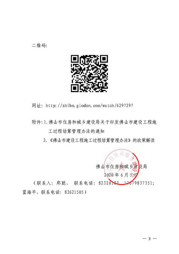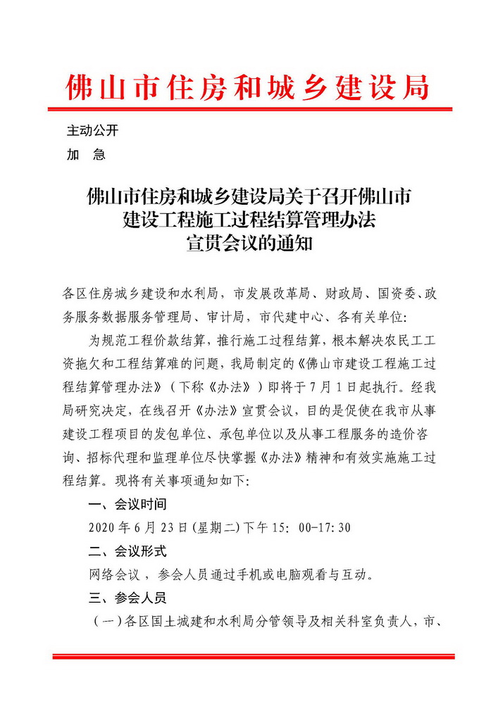 转佛山市住房和城乡建设局关于召开佛山市建设工程施工过程结算管理办法宣贯会议的通知(2020/06/16)