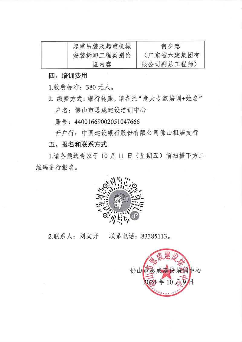 关于举办佛山市危险性较大分部分项工程安全专项方案专家评审论证案例分析专题研修班的通知(2024/10/09)