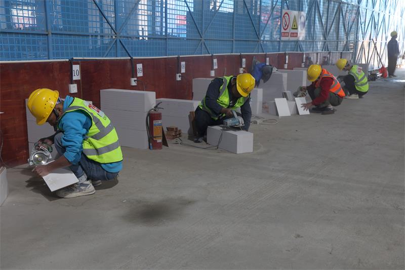 选手在认真地进行水泥砂浆的涂抹
