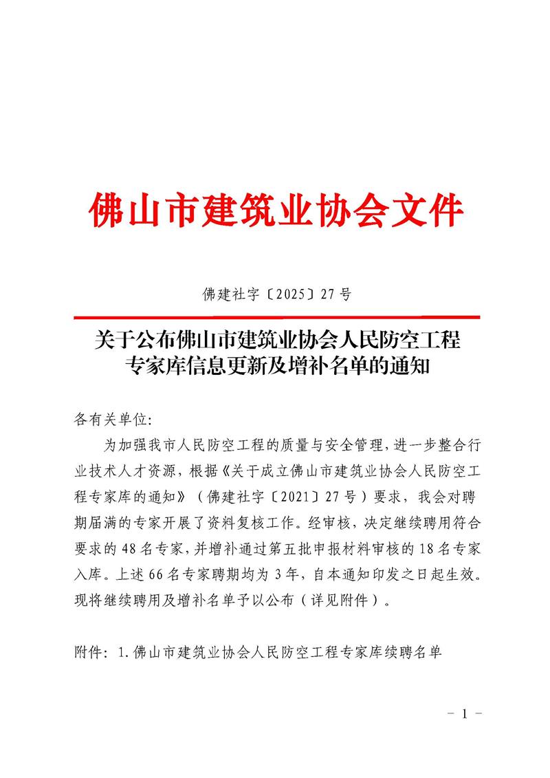 关于公布佛山市建筑业协会人民防空工程专家库信息更新及增补名单的通知(佛建社字〔2025〕27号)