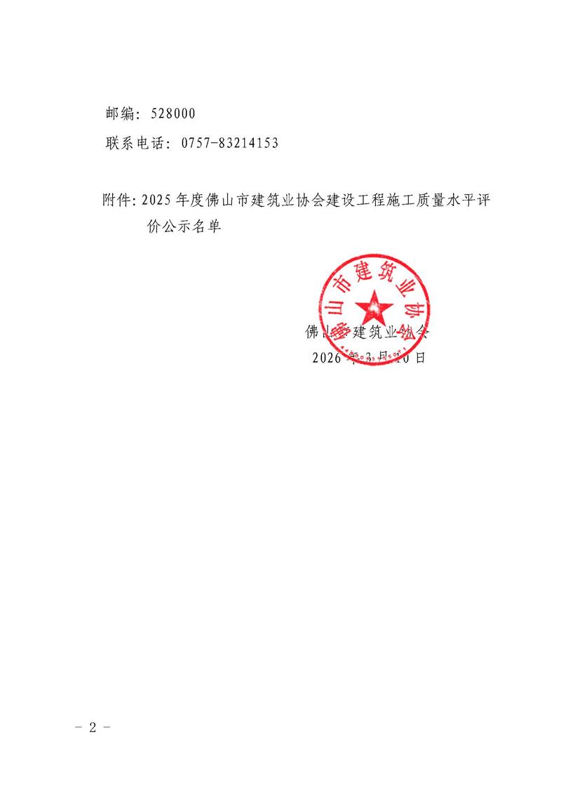 关于2025年度佛山市建筑业协会建设工程施工质量水平评价情况的公示(佛建社字〔2026〕3号)
