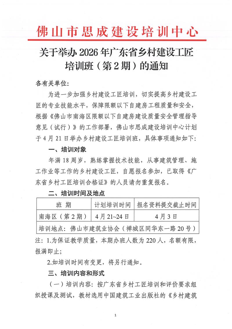 关于举办2026年广东省乡村建设工匠培训班(第2期)的通知(2026/03/24)