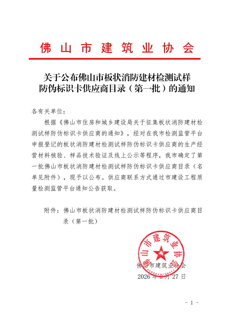 关于公布佛山市板状消防建材检测试样防伪标识卡供应商目录(第一批)的通知(2026/03/27)